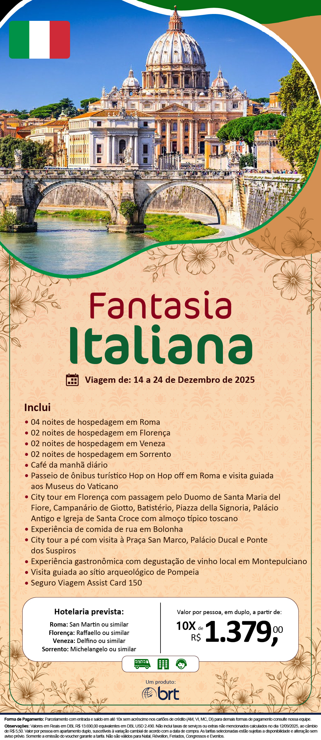 Observações: Valores em Reais em DBL R$ 13.690,00 equivalentes em DBL USD 2.490. Não inclui taxas de serviços ou extras não mencionados calculados no dia 12/09/2025, ao câmbio de R$ 5,50. Valor por pessoa em apartamento duplo, suscetíveis à variação cambial de acordo com a data de compra. As tarifas selecionadas estão sujeitas a disponibilidade e alteração sem aviso prévio. Somente a emissão do voucher garante a tarifa. Não são válidos para Natal, Réveillon, Feriados, Congressos e Eventos.