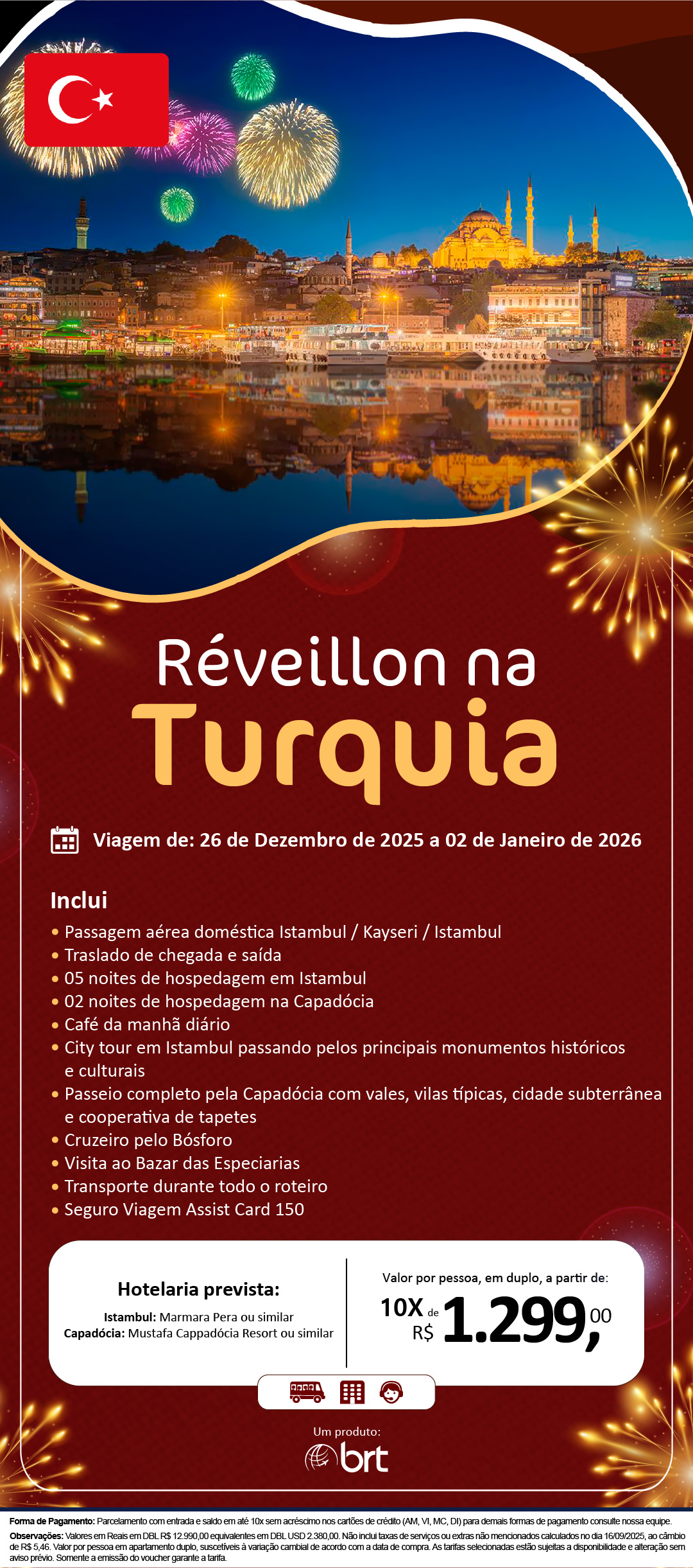 Observações: Valores em Reais em DBL R$ 12.990,00 equivalentes em DBL USD 2.380,00. Não inclui taxas de serviços ou extras não mencionados calculados no dia 16/09/2025, ao câmbio de R$ 5,46. Valor por pessoa em apartamento duplo, suscetíveis à variação cambial de acordo com a data de compra. As tarifas selecionadas estão sujeitas a disponibilidade e alteração sem aviso prévio. Somente a emissão do voucher garante a tarifa.