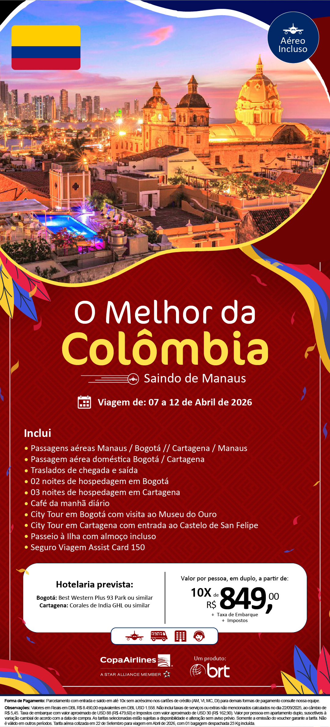 Observações: Valores em Reais em DBL R$ 8.490,00 equivalentes em DBL USD 1.558. Não inclui taxas de serviços ou extras não mencionados calculados no dia 22/09/2025, ao câmbio de R$ 5,45. Taxa de embarque com valor aproximado de USD 88 (R$ 479,60) e Impostos com valor aproximado de USD 30 (R$ 162,90). Valor por pessoa em apartamento duplo, suscetíveis à variação cambial de acordo com a data de compra. As tarifas selecionadas estão sujeitas a disponibilidade e alteração sem aviso prévio. Somente a emissão do voucher garante a tarifa. Não é válido em outros períodos. Tarifa aérea cotizada em 22 de Setembro para viagem em Abril de 2026, com 01 bagagem despachada 23 Kg incluída.