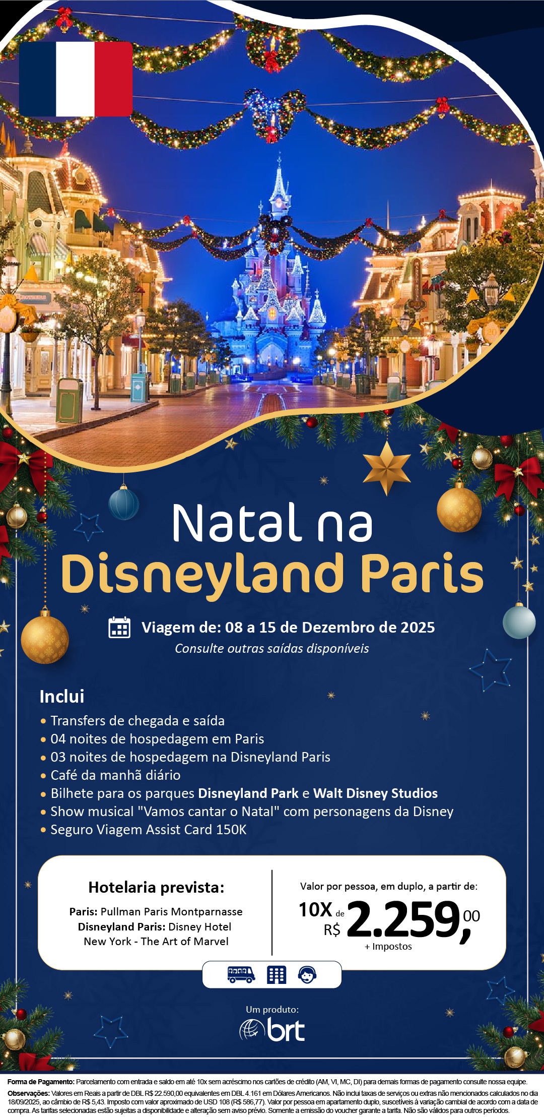 Observações: Valores em Reais a partir de DBL R$ 22.590,00 equivalentes em DBL 4.161 em Dólares Americanos. Não inclui taxas de serviços ou extras não mencionados calculados no dia 18/09/2025, ao câmbio de R$ 5,43. Imposto com valor aproximado de USD 108 (R$ 586,77). Valor por pessoa em apartamento duplo, suscetíveis à variação cambial de acordo com a data de compra. As tarifas selecionadas estão sujeitas a disponibilidade e alteração sem aviso prévio. Somente a emissão do voucher garante a tarifa. Não são válidos para outros períodos.